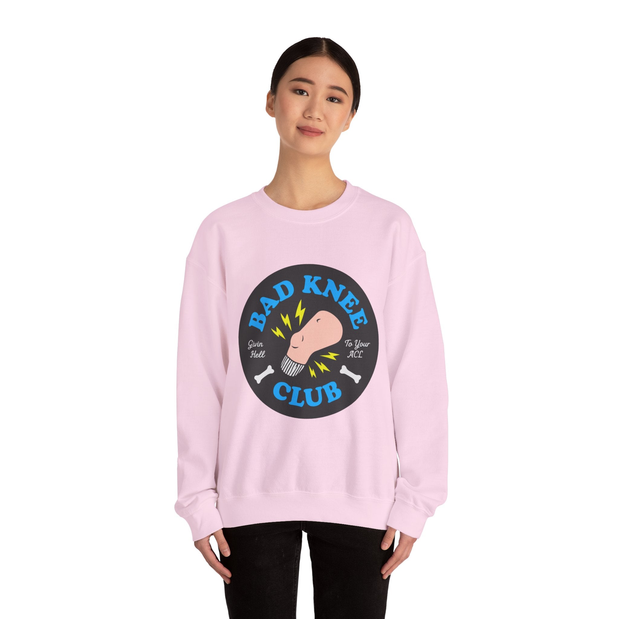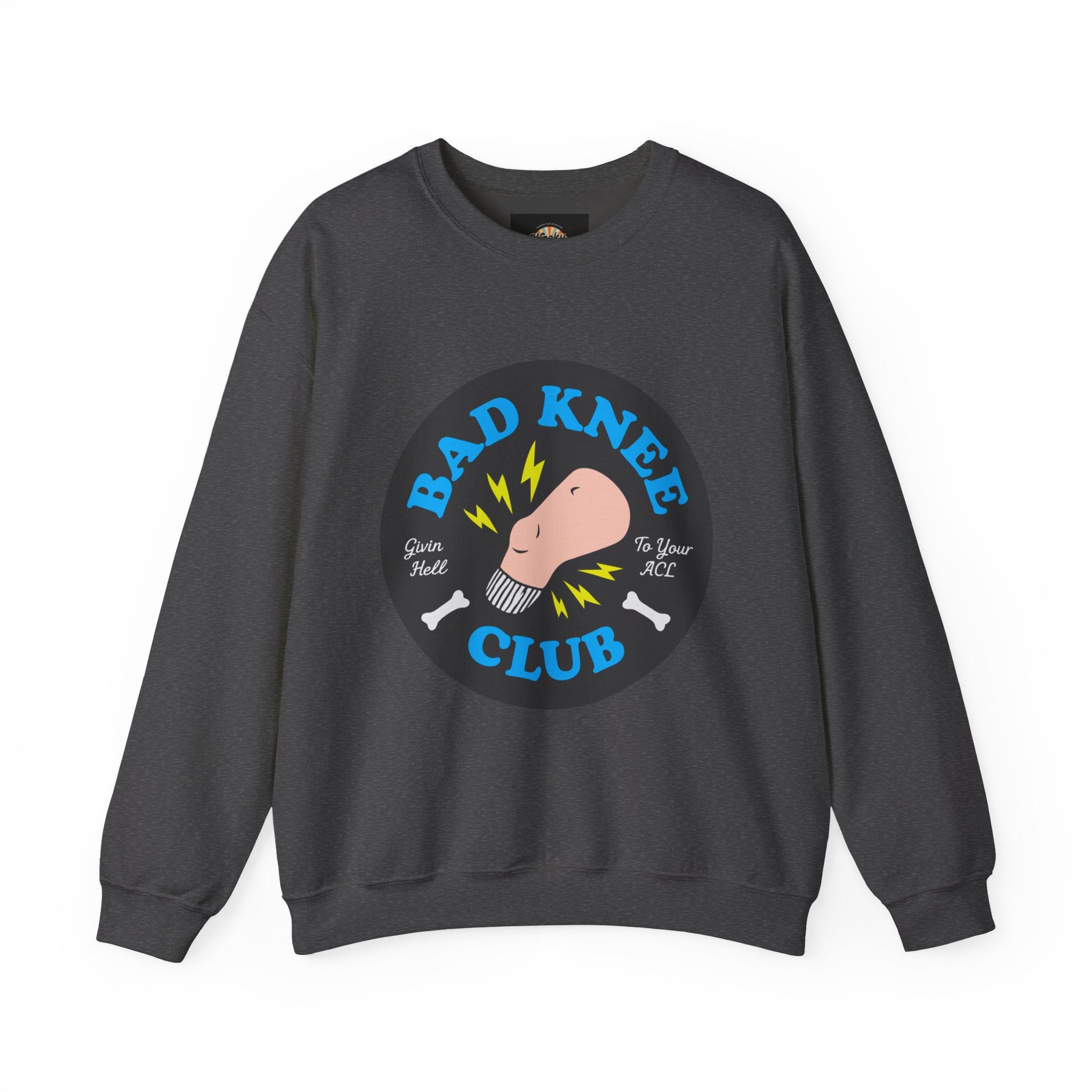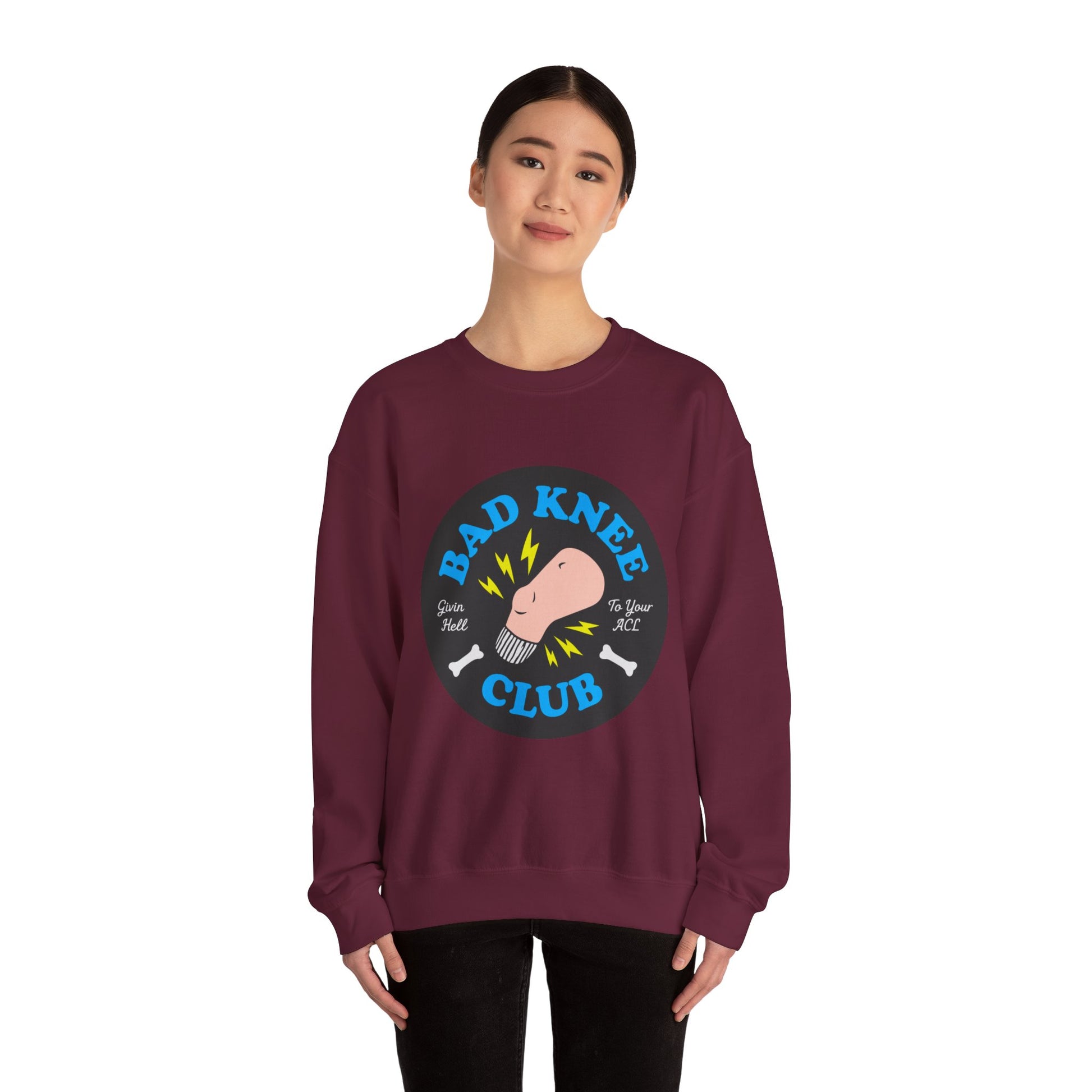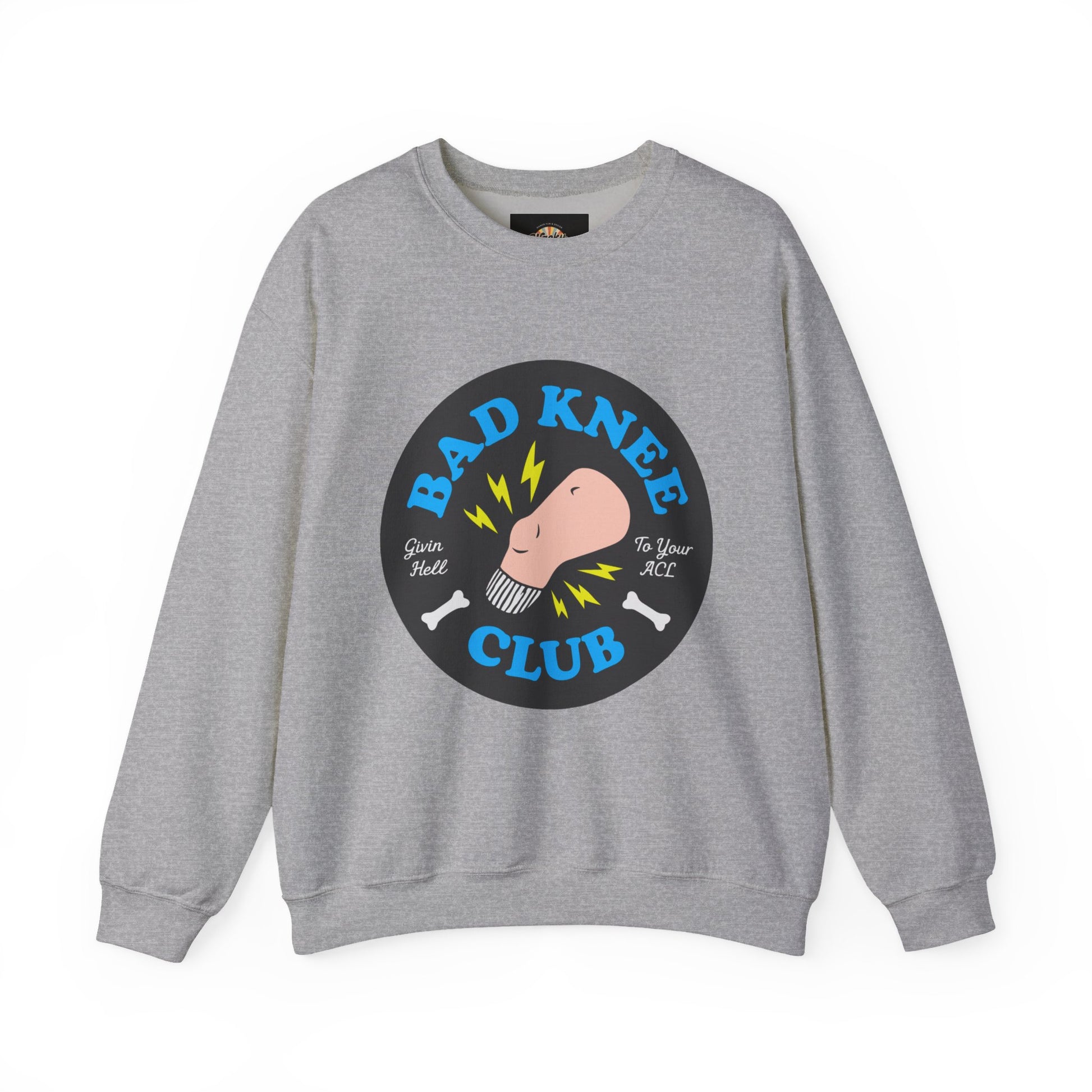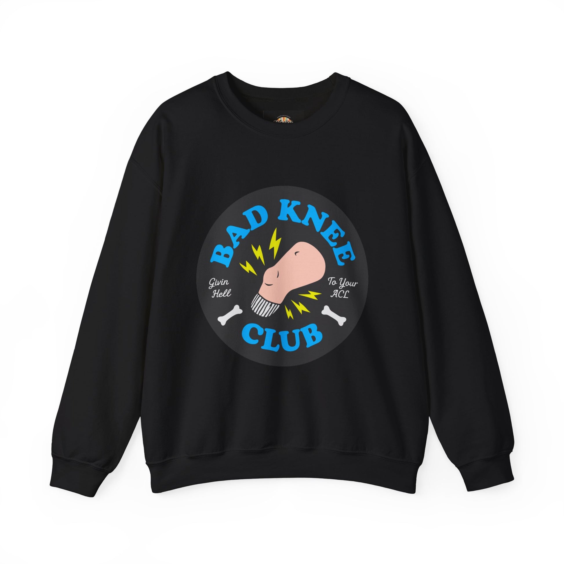 This midweight crewneck wraps you in cozy comfort while proudly declaring your membership in the BAD KNEE CLUB, featuring a bold circular graphic with a bent knee, lightning accents, and tiny bone icons that hit just a little too close to home.
