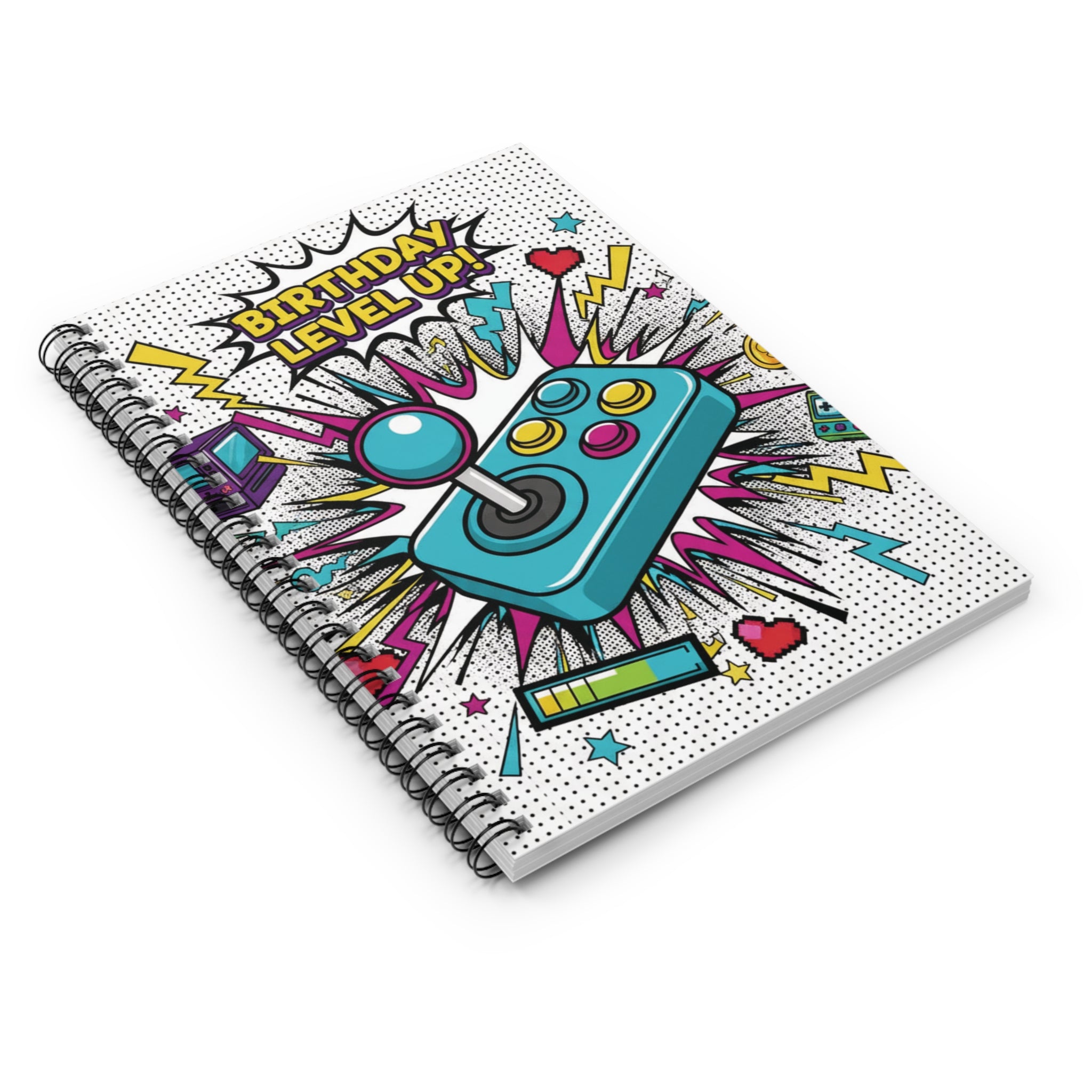Bright, playful spiral notebook designed for gamers and anyone who loves retro arcade vibes. The front cover bursts with a colorful joystick, pixel hearts, and comic-style sound effects that shout “Birthday Level Up!” — a fun way to mark a new year, a milestone, or a creative sprint. The ruled 90gsm pages take ink well and make writing smooth, while the sturdy 350gsm covers protect your notes between sessions. A metal spiral lets the notebook lie flat or fold back for comfortable one-handed play, and an inside back pocket keeps loose cards, receipts, or stickers safe. Compact and energetic, this notebook slips easily into backpacks or desk drawers, ready for journaling, sketching game ideas, or jotting down level walkthroughs.