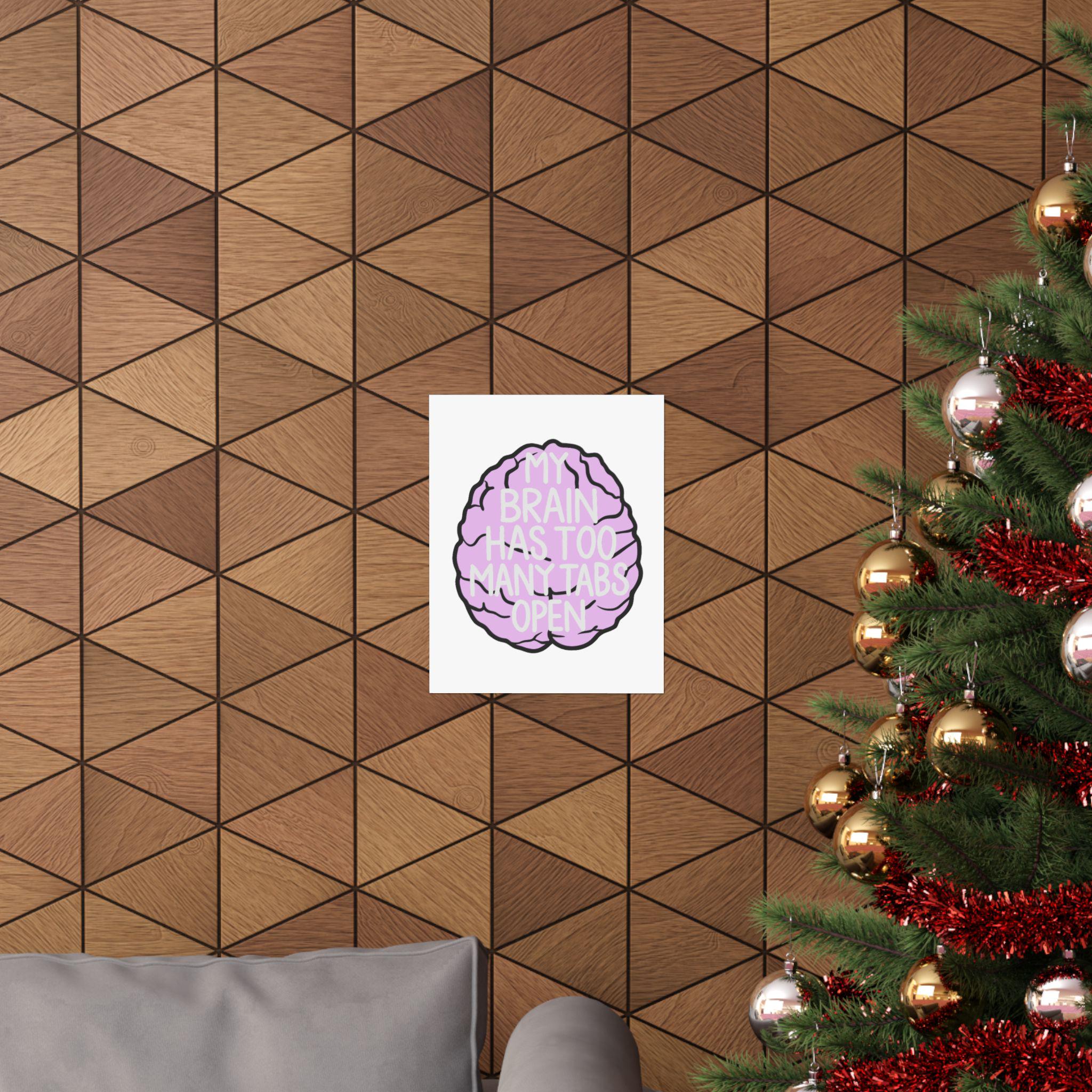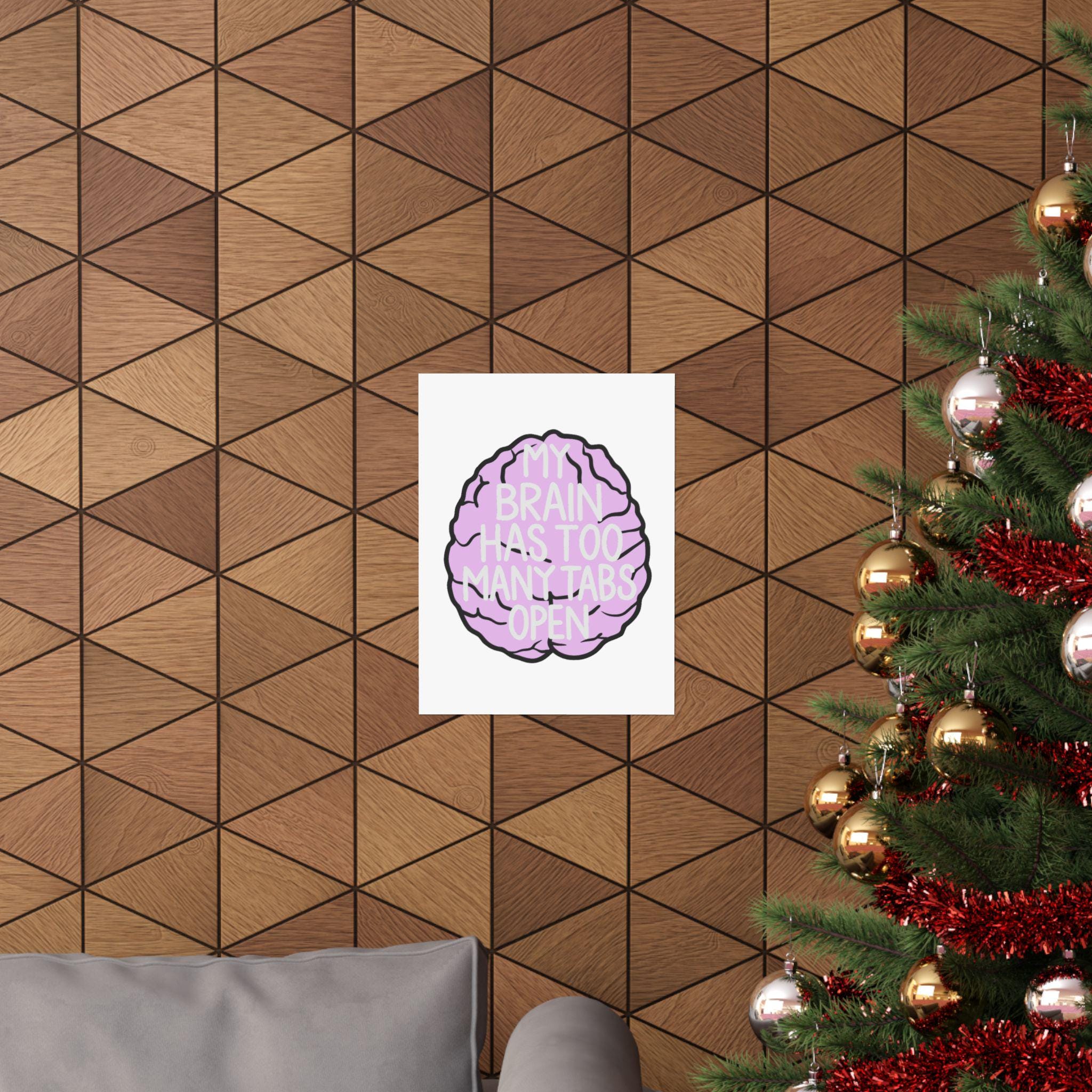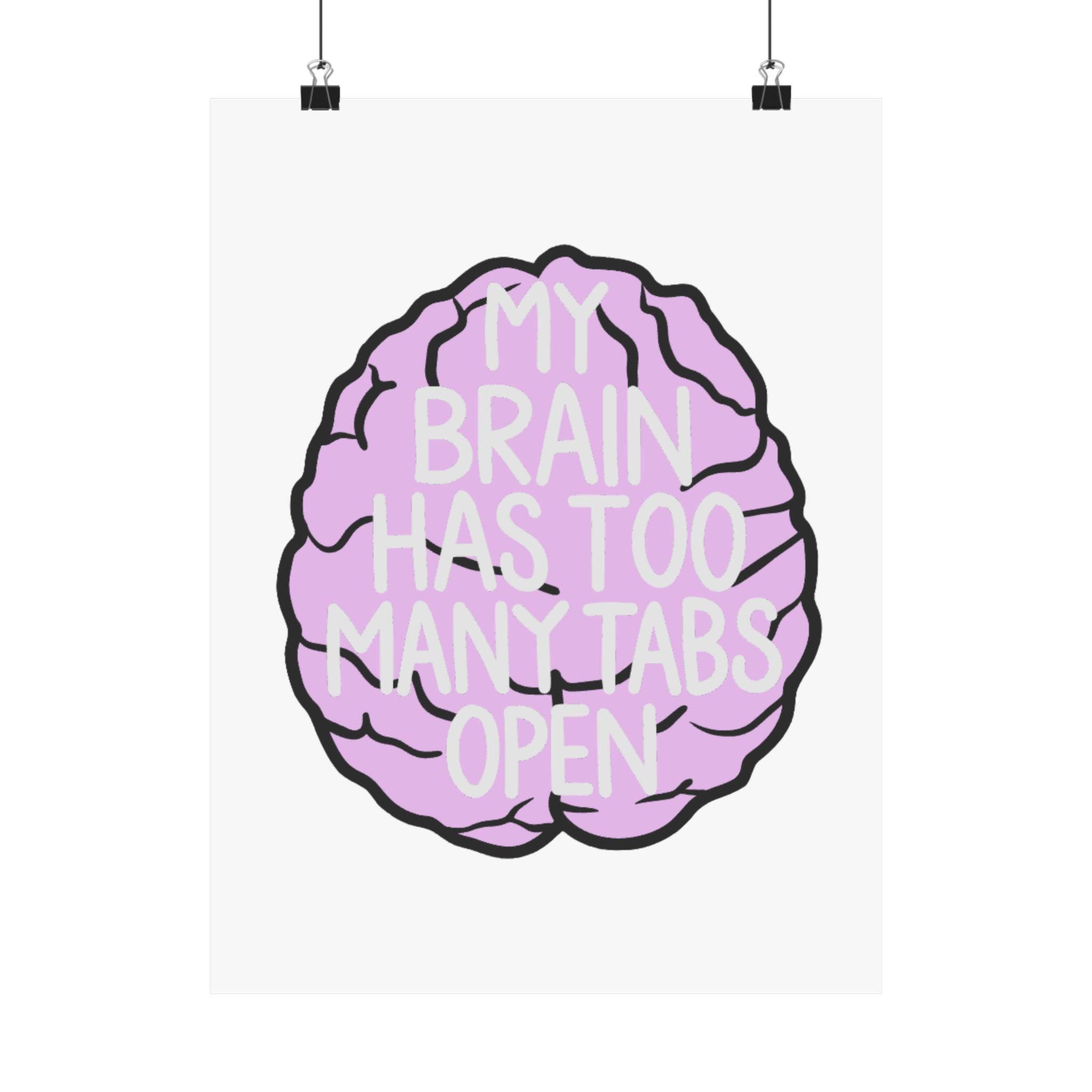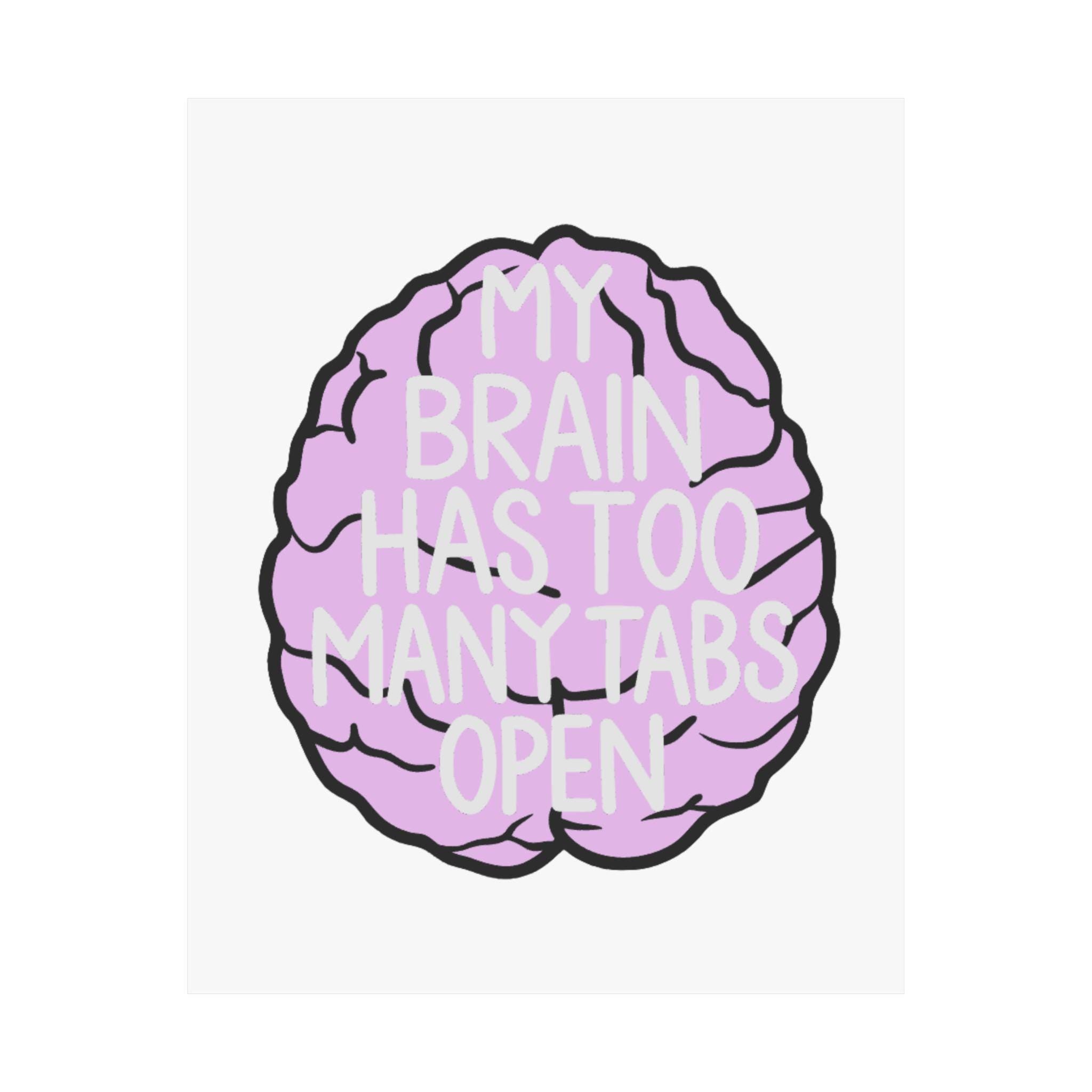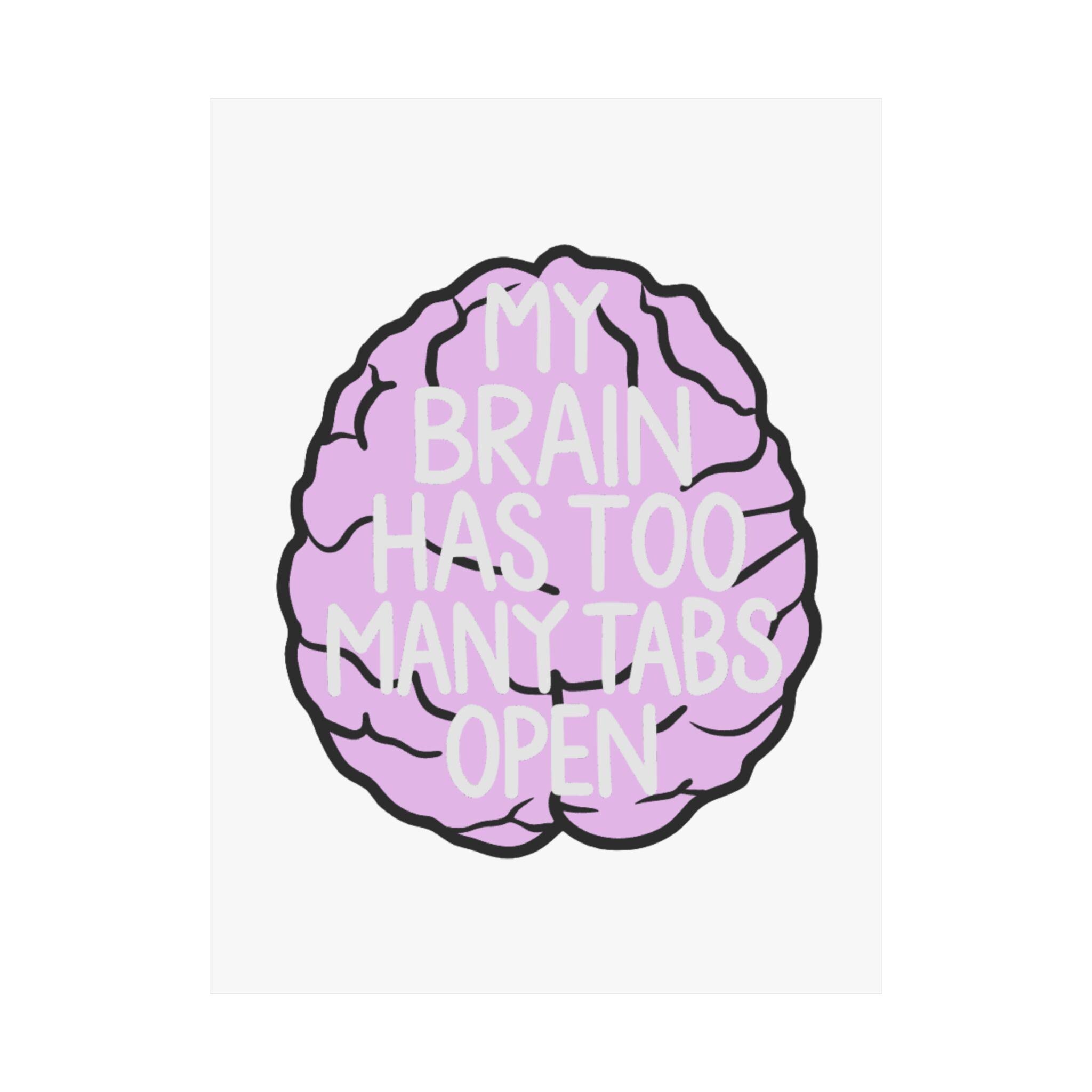 A playful, artful poster for anyone who lives with a busy mind. This matte vertical poster features a soft-lilac cartoon brain with hand-drawn black outlines and the cheeky phrase “MY BRAIN HAS TOO MANY TABS OPEN” layered in light, readable type. Printed with museum-grade archival paper and giclée inks, the image stays bright and true while the matte finish reduces glare and keeps the colors feeling warm and approachable. Hang it above a desk, in a home office, or by a study nook to acknowledge the daily juggling of tasks with a wink. The design reads as both humorous and empathetic — a small reminder that scattered thoughts are part of creative, modern life.