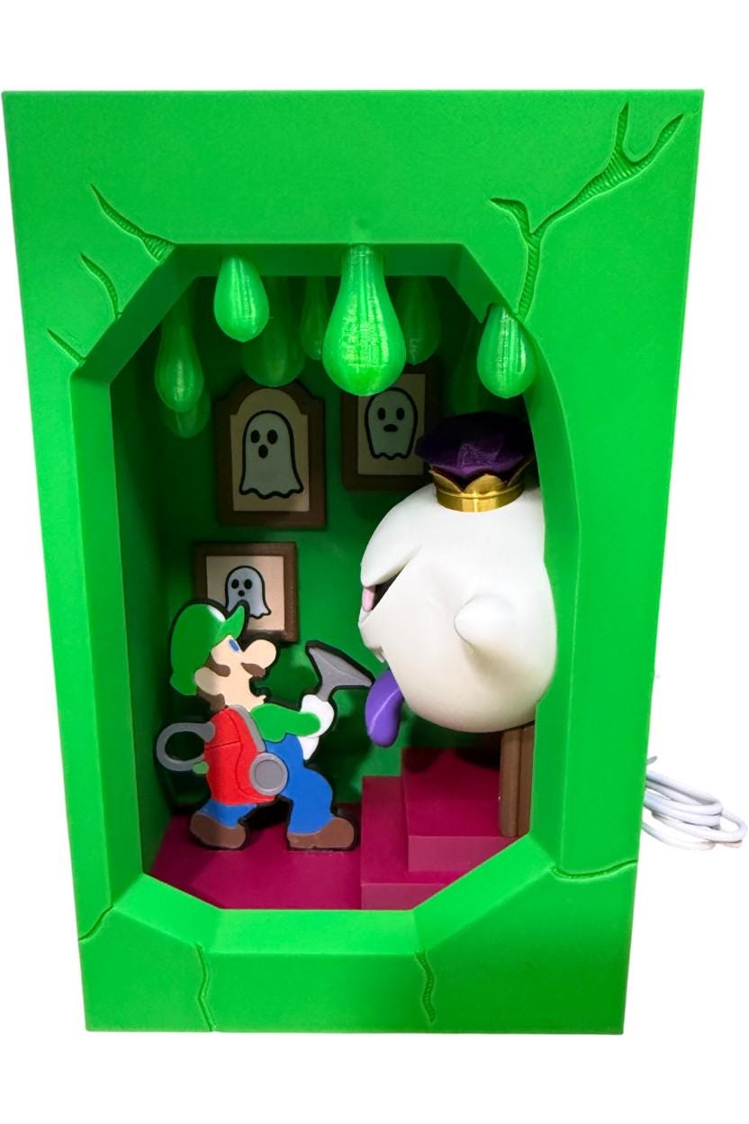 This Broken Brick Light Display Series is a handcrafted, 3D-printed shadow-box-style display inspired by iconic retro-gaming scenes. Each piece features a dramatic "broken wall" reveal with layered depth, character detail, and vibrant internal lighting that brings the scene to life.